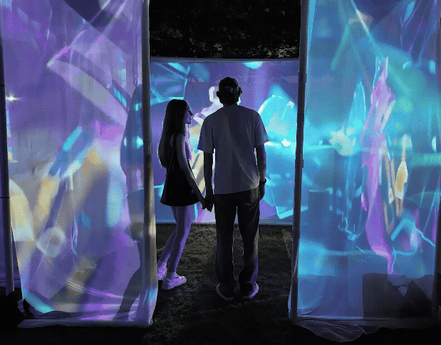Selected as one of the artists for the PULSE Art + Technology Festival at the Jepson Center, Prismatic Echoes was featured alongside Jim Campbell’s exhibition. This immersive projection mapping installation transformed the museum’s grand atrium and staircase as it was the first impression when walking into the museum. The grand staircase came alive with colorful geometric patterns inspired by the Rubik’s Cube, while the atrium wall showcased a mesmerizing mandala crafted from crystal formations. Prismatic Echoes invited guests to experience a dynamic experience of color, shape, and energy, setting the stage for the festival’s exploration of art and technology.